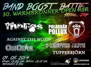 Warmbronner Open-Air Jump 2014 Nicht nur das LKA feiert sein 30-Jähriges, sondern auch das kultige Open-Air in Warmbronn. Als eines der Ersten seiner Art hat es über die Jahrzehnte hinweg nicht nur renommierte, internationale Bands am Start gehabt, sondern auch schon vielen lokalen Acts den Weg nach vorne geebnet. Bei unserem Showcase am heutigen Tag vergeben wir einen Slot beim WaOAir 2014. Dabei wird eine Booker-Delegation aus Warmbronn von der Bühne weg ihren Wunschkandidaten für das Jubiläumsfestival vom 1. - 3.8.2014 engagieren.... Um den begehrten Platz rocken: