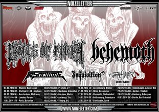 BEHEMOTH und CRADLE OF FILTH – bringen die Dunkelheit auf Co-Headliner-Tour nach Europa! Der Februar verspricht, ganz im Zeichen einer pechschwarzen Sonne zu stehen: denn die britischen Dark / Black Metal-Fan Faves CRADLE OF FILTH werden sich zusammen mit den polnischen Death / Black Metal-Legenden BEHEMOTH auf große Europa-Co-Headlinertournee (19 Dates!) begeben... Waren BEHEMOTH zu Anfangstagen (also ca. „Sventevith“ 1995) noch klar auf Black Metal gepolt, verschoben sich die Prioritäten von Mastermind Nergal zügig: man polterte in den kommenden Jahren in Richtung Death Metal los, und zusammen mit einigen progressiv-experimentellen Einflüssen wandelten sich BEHEMOTH mit Scheiben wie „Zos Kia Cultus“ (2002) zu einem vielköpfigen und einzigartigen Biest! Nachdem Frontmann Nergal glücklicherweise nach „Evangelion“ (2009) seine Leukämie-Erkrankung bezwingen konnte, wird die Band 2014 „The Satanist“ vom Stapel lassen. Man darf auf düstere Shows gespannt sein, die Avantgardismus mit schwarzen Messen paaren!!! Nergal zur Headliner Tour: "We are immensely proud to start promotion of "THE SATANIST" on the release date of the album in such a noble company. It's been a while since we toured Europe for the last time... The wolf pack grew stronger and hungrier and with new opus and stage production we have so much more to offer. This European crusade will be the catalyst of 2 years long tour so keep your eyes open!" Gothic Horror von der Leinwand auf Schallplatte zerren – die Spezialität der Grammy-nominierten britischen Urgesteine CRADLE OF FILTH! Kultalben wie „The Principle Of Evil Made Flesh“ bewiesen Mitte der 90er Jahre, dass authentischer Black Metal nicht zwingend aus Norwegen kommen muss. Inzwischen lässt man auch gerne Dark- und Death Metal-Nuancen in den Sound einfließen, und zuletzt konnte man Dani Filths „Märchen für Erwachsene“ auf „The Manticore And Other Horrors“ 2012 bestaunen. Diese Headliner-Tour wird das 20jährige Jubiläum von „The Principle Of Evil Made Flesh“ markieren – bereitet Euch also auf „Supreme Vampyric Evil“ von einem der größten Namen im Extreme Metal vor. Vokillist Dani Filth kommentiert: "We are very much looking forward to touring with Behemoth et al, as I think the combined line-up for these momentous shows is definitely very killer. Prepare for some riotous shows immersed in such esteemed dark company, as Cradle traverses an Old Skool tour programme set against a viscerally visual backdrop of nocturnal metal supremacy. In other words, be there or be squared. Pinhead-style!" Die Schweden IN SOLITUDE werden oft lästerlich als „die besseren Mercyful Fate“ bezeichnet – ohne an deren Erbe kratzen zu wollen, ist es doch erstaunlich, was für fesselnden und Hit-geladenen Metal zwischen 80s-Spirit und unheiliger Atmosphäre seit dem selbstbetitelten Debüt 2008 von den Herren aus Uppsala geboten wird! Aktuell begeistert man mit dem dritten Reißer „Sister“ bei Metal Blade Records, das von der Presse hochgelobt wird und den Status von IN SOLITUDE als eine der originellsten Bands der Stunde unterstreicht! Die Scheibe wird sicherlich in einigen „Platten des Jahres“-Listen auftauchen... Ursprünglich in Kolumbien Ende der 80er Jahre gegründet, siedelte das Duo INQUISITION bald nach Amerika um, um dort wahrlich satanistischem Black Metal zu huldigen! „Obscure Verses For The Multiverse” heißt das brandneue Album der Veteranen: darauf schweißt man das eingängige Riffs, pure Raserei, zerstörerische Atmosphäre und blasphemische Texte zu einem pechschwarzen Amalgam zusammen, das sogar Immortal Konkurrenz macht... Eröffnen werden den dunklen Reigen SVARTTJERN – die Osloer Brigade suhlt sich auf Scheiben wie „Towards The Ultimate“ gerne in literweise Misanthropie und True Norwegian Black Metal, der Erinnerungen an die glorreichen Zeiten Anfang der 90er wach werden lässt!!! Am 7. Februar wird das dritte SVARTTJERN-Album „Ultimatum Necrophilia“ erscheinen, das sich alle Fans von nordischem Hass auf den Einkaufszettel schreiben sollten! Tickets für dieses fantastisch blasphemische Package gibt es wie immer unter