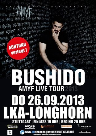 Im September/ Oktober 2013 geht Bushido auf Tour, um sein Nummer-1-Album „AMYF“ zu präsentieren. Unter anderem macht der mehrfach ausgezeichnete Deutschrap-Star Halt in Stuttgart (Leinfelden-Echterdingen) und im Rhein-Main-Gebiet (Neu-Isenburg). Wiesbaden, 19.10.2012 — Wo Bushido draufsteht, ist Bushido drin. Für sein aktuelles Album gilt dieses Credo in doppelter Hinsicht. Denn er präsentiert sich seinen Fans erstmals auf einem Doppelalbum.