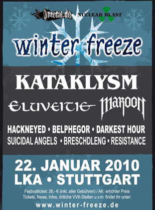 Nach ausverkauften Jahren in Abtsgmünd wandert das Winter Freeze etwas weiter in den Süden und macht es sich im legendären LKA zu Stuttgart gemütlich. Das LKA ist die Location in der Region und fasst auch ein paar Zuschauer mehr, als die Kochertal-Metropole in Abtsgmünd. Sonst hätte es bei dieser hochkarätigen Besetzung wohl noch mehr enttäuschte Gesichter an der Abendkasse gegeben, als beim ausverkauften Festival 2009. Die kanadische Death Metal-Institution Kataklysm muss man wohl niemandem mehr vorstellen. Sie sprechen in Bezug auf ihren Stil selbst von „Northern Hyperblast“ und Drummer Nick Miller tut auch alles, dem Rechnung zu tragen! Die Schweizer Pagan Folk-Metalband Eluveitie hat in den vergangenen Jahren im Sturm die Herzen der Fans erobert. Seitdem sie einen Vertrag mit Nuclear Blast abgeschlossen haben, geht es steil aufwärts mit den sympathischen Schweizern, die für ordentlich Stimmung aber auch Nackenschmerzen am nächsten Tag sorgen werden. Maroon gehört zur absoluten Speerspitze im nationalen Metalcore-Business und ihr aktuelles Album »Order« ist sogar auf Platz 63 in die Album-Charts geschossen. Aus dem benachbarten Österreich sind Belphegor mit im Rennen um den Titel der heftigsten Band des Festivals, denn sie mischen in ihren Sound auch noch ein gutes Pfund Schwarz. Neben Maroon ist mit Darkest Hour ein weiteres Metalcore-Highlight im LineUp. Ihr 2007er-Album „Deliver Us“ gilt als Meilenstein und die US-Amerikaner von Darkest Hour sind seit Jahren eine unermüdliche Macht in Sachen Liveperformance. Mit den Suicidal Angels wurde sogar eine griechische Band für das Festival verpflichet. Das Quartett hat sich gegen tausende von Mitbewerbern beim Newcomercontest von Nuclear Blast durchgesetzt. Traditionell sind den Veranstaltern auch lokale Acts wichtig und mit Breschdleng haben sie eine der einzigartigsten Bands im süddeutschen Raum an Bord geholt. Den Anfang gestaltet das Death Metal-Kommando Resistance aus Belgien. Neben dem ausgewogenen Bandangebot überzeugt hier erneut auch das Preis-Leistungsverhältnis. Denn wer sich seine Karte bereits im Vorverkauf sichert, zahlt gerade mal 26 Euro – ein derart hochklassiges, internationales und breit gefächertes LineUp dürfte zu diesem Preis wahrlich konkurrenzlos sein. Es empfiehlt sich also unbedingt im Vorfeld Tickets zu ergattern. Winter Freeze 2010 Winter Freeze Fr. 22. Januar | LKA | Stuttgart www.winter-freeze.de