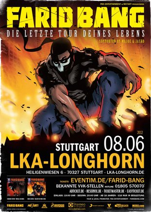Aber auch live setzt FARID BANG dieses Jahr noch mal einen drauf, nachdem bereits die Tour im vergangenen Jahr größtenteils ausverkauft war oder in größere Hallen verlegt werden musste. Im Mai und Juni 2012 rockt FARID BANG die großen Bühnen Deutschlands, Österreichs und der Schweiz mit einer grandiosen Show.
