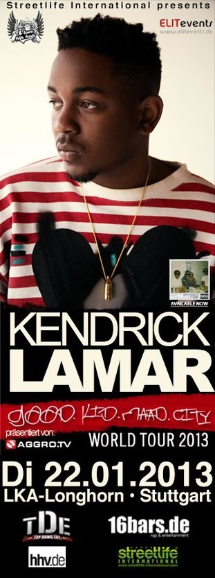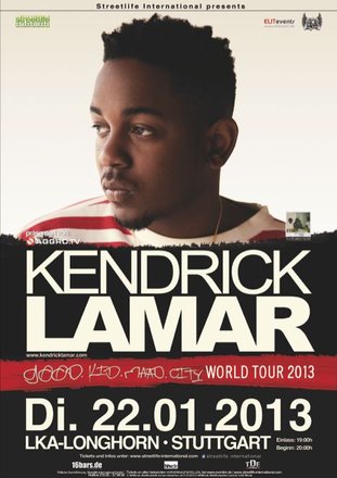 Von Dr. Dre, Snoop Dogg und The Game ist Kendrick Lamar bereits als "The New King of the Westcoast" betitelt worden. Sein Major-Debüt "good kid, m.A.A.d. city", welches am 22. Oktober 2012 über Dr. Dre’s Aftermath Entertainment veröffentlicht worden ist, hat sich in einer einzigen Woche bereits 242.000 Mal verkauft. Es ist somit nicht nur das erfolgreichste Hip Hop Album des Jahres, sondern wird schon jetzt von der Fachpresse als Hip Hop Klassiker angesehen. Der US-amerikanische Rapper und Songschreiber hat das Talent und die Motivation, um aus dem großen Einheitsbrei der Hip Hop-Szene hinauszustechen. Er verfügt über die Stimme von Q-Tip, die Aura des frühen Jay-Z und den Geist von Tupac Shakur. Anfang 2013 kommt das größte Talent der Westküste seit The Game für zahlreiche Termine nach Deutschland.