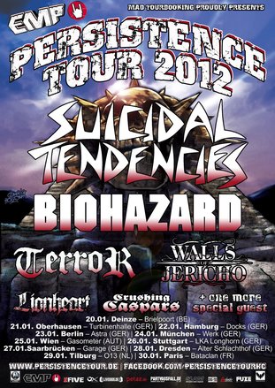 Eine Premiere feiert die Persistence Tour in 2012 . Zum ersten Mal findet die einzige süddeutsche Show mit internationalen Top Acts aus Metal und Hardcore im Januar statt. Die Persistence Tour dürfte so jedem der auf Hardcore oder Metal steht, ein Begriff sein. Größer. länger und aufwendiger als alle vergleichbaren Tourneen ist sie wohl das großartigste Event dieser Art in Europa. Als Headliner steht Suicidal Tendencies fest. Wir sind gespannt wer die Kultband 2012 supporten darf.