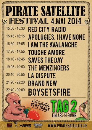 Eine Band, die sich in 2013 sehr rar gemacht hat. Wir durften schon einige Songs hören und können glonzvolle versprechen. Wir freuen uns riesig, daß LA DISPUTE beim PIRATE SATELLITE FESTIVAL dabei sind. Ebenso großartig finden wir, daß THE MENZINGERS erneut zugesagt haben in Stuttgart zu spielen Die Band reist mit neuem Album zum PIRATE SATELLITE FESTIVAL 2014 Das aktuellle LINEUP sieht nun wie folgt aus: