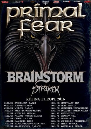 PRIMAL FEAR veröffentlichen im Januar 2016 das brandneue Album "RULEBREAKER", begleitet von einer großen Headliner Tour durch Europa im Februar 2016! Als Co-Headliner werden BRAINSTORM das neue Album "Scary Creatures" live zelebrieren, und als Support STRIKER aus Kanada ihr neues Werk ebenfalls live vorstellen. www.primalfear.de www.brainstorm-web.net www.striker-metal.com
