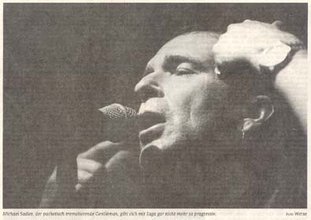 Nach der obligatorisch klassizistisch geschwollenen Synthesizer-Ouvertüre stiegen sie dort in alter Frische auf die Bühne, die fünf von Saga: vorneweg Michael Sadler, der pathetisch tremolierende Gentleman. Knapp dahinter der Gitarrenderwisch lan Crichton, der dermaßen schnell mit den Fingern über das Griffbrett fährt, um es zu strangulieren, auf ihm zu vibrieren, mit den Fingerkuppen zu hämmern, die Saiten zu zerren und zu quälen, Triolen, Arpeggien, ach was, alles bloß denkbar mögliche Tonmaterial virtuosenflink loszueisen und in so sagenhafter Windeseile ins Publikum zu schicken, dass einem Hören und Sehen vergeht. Stets freundliche Miene zu solch geschliffen technokratischem Spiel machte sein Bruder Jim Crichton am Bass, der zumindest optisch mehr mit dem barock gelockten Jim Gilmour hinter seiner monumentalen Keyboardburg verwandt zu sein scheint. Der aufgeräumt wirkende Kumpeltyp Steve Negus komplettierte mit mittlerem Tempo und Temperament den Fünfer, der sich nun wacker durch die Monotonie des ersten Konzertteils kämpfte.