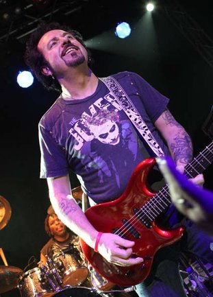 Smith is going in for a bluesy basis in Lukather's playing: "For all his versatility I tend to think of Steve as a turbo-charged blues player: all the standard blues ideas are present - bends, vibrato and pentatonic scales but they are played with a modern tone and some serious bursts of tricky alternate picking. In short, loads of fun! One of the main facets of Lukather's lead style is the blending of pentatonics and modal scales which gives his lines a more sophisticated sound without trespassing into jazz-territory (though he can do this as well... grrr!). Soundwise, it's fair to say that Steve is not afraid of technology - he was one of the first to popularise the Ridiculously Huge Effects Rack (TM) and for a long time was associated with Valley Arts guitars. These days he has a signature model MusicMan guitar, the 'Luke' plugged into Rivera Knucklehead amps."