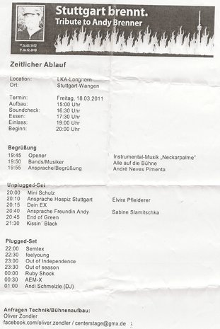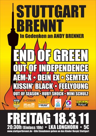 Am Freitag, 18.03.2011 findet in Stuttgart im Longhorn-Kultur-Austausch (LKA) ein Gedenk Musikfest statt „STUTTGART BRENNT – in Gedenken an Andy Brenner“. Einlass ist um 19 Uhr / beginn: 20:30 Uhr UKB: 5 € Im Alter von nur 38 Jahren ist Andy Brenner am 28.12.2010 verstorben – nach einer tragischen Krebserkrankung. Andy Brenner war mit seinem Herzen und seinem Glauben die Personifizierung von Hingabe und Engagement für die Elemente der Jugend-Musik-Kultur: Stuttgart Brennt, Noise Gate, Cumulus Kulturbüro, Popbüro Region Stuttgart, LKA und seine Mitarbeit und Betreuung sämtlicher Jugendhäuser, Soundchecks, Management und vielen Konzerten ... Mit Andy ist ein Freund von uns gegangen, der sich bis zuletzt gegen den Tod gewehrt hat. Es war, als wollte er ihn nicht an sich heranlassen, weil er mit seiner Lebensaufgabe noch nicht fertig war. Die Bands auf der Bühne haben entweder mit Andy gearbeitet oder waren einfach nur befreundet mit ihm. Und auch wenn manche Band sich schon auflöste, haben sie sich für diesen besonderen Abend wieder zusammengefunden. Bisheriges Line Up: *Mini Schulz & Friends *Dein eX *Kissin´ black *Semtex *feelyoung *Out Of Independence *Out Of Season *Ruby Shock *Aem-X + *Special Guest Alle Eintrittsgelder gehen zugunsten des Kinder Hospiz in Stuttgart. Unter der Aufsicht von Frau Elvira Pfleiderer, wird es einen Infostand am Abend haben und Frau Pfleiderer wird auch kurz über die Arbeit des Kinder Hospiz informieren. Das Hospiz Stuttgart begleitet seit 24 Jahren Menschen am Lebensende. Seit 7 Jahren unterstützen sie auch durch ihren ambulanten Kinderhospizdienst Familien mit einem lebensbegrenzt erkrankten Kind im häuslichen Umfeld. Frau Pfleiderer arbeitet seit mehr als 13 Jahren im Hospiz und ist sehr vertraut mit den Aufgaben und der Verantwortung. Wir sagen Danke für alles, was er jedem von uns an Einsatz, Freundschaft und Vorbildlichkeit gegeben hat. Gemeinsam heißt es ein letztes Mal... Stuttgart brennt - Andy wir denken an Dich. Freitag, 18.03.2011 Longhorn-Kultur-Austausch (LKA) Einlass: 19:00 Uhr / Beginn: 20:30 Uhr UKB: 5 € (Alle Einnahmen gehen an das Kinder Hospiz in Stuttgart)