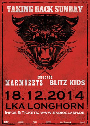 die Veranstaltung von TAKING BACK SUNDAY am 18.12.2014 wird vom Lka Longhorn ins Universum / Stuttgart verlegt. Bereits gekaufte Tickets behalten Ihre Gültigkeit. Zeiten und Preise bleiben unverändert.