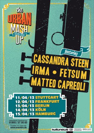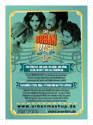 URBAN MASH UP ist eine musikalische Mischung aus Soul und Funk - ein ganzes Paket intelligenter und gutgelaunter Musik. Der musikalische Input der ganzen Welt wird genutzt, um als frisch gespeistes Kraftwerk auf der Bühne zu stehen. Wo sonst kann man es so heftigst knistern lassen zwischen zuckenden Zuschauerbeinen und trommelnden Musikerfingern?