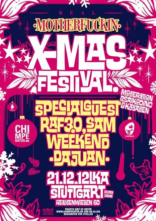 So, der Sommer ist vorbei. Knappe Bikinis und kaltes Bier werden langsam aber sicher gegen Winterjacken und Glühwein getauscht. Findet Euch damit ab. Doch der Winter hat auch Gutes: Das Chimperator X-Mas Festival! Das Stuttgarter Indoor-Festival findet nunmehr zum 7. Mal statt und wächst jährlich. Dieses Jahr, größer, geiler und weihnachtlicher als je zuvor. Im LKA! Außerdem packt der Weihnachtsmann dieses Jahr ganz besondere Gäste aus seinem Sack: Raf 3.0, der mit seinem gleichnamigen Album dieses Jahr einen Top 10 Erfolg erzielen konnte. Dazu einen der wohl angesagtesten Rapper zur Zeit: Weekend. Der VBT-Sieger 2012 ist momentan in aller Munde und bald mit Sicherheit auch auf dem Juice-Cover. Nackt! Außerdem bringt uns das Christkind oder der Weihnachtsmann, oder wer auch immer für die Geschenke verantwortlich ist, die beiden Jungs von SAM. Die Chimperator-Neulinge, die als Support bei Cros Raop-Tour voll überzeugen konnten und deren Mixtape ZWEInullZWÖLF von Kids deutschlandweit gefeiert wird. Mit dabei auch DaJuan, Cros alter Weggefährte, der mit seinen Songs „Ich will“ und „Girls“ Rap-Fans neugierig gemacht hat. Wer ihn live erleben möchte, kommt. Da es Weihnachten nicht ohne Überraschungen gibt, ist der Headliner noch geheim. Special Guest also. Seid gespannt. hO hO hO!