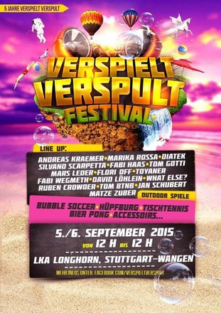 Verspielt-Verspult feiert seinen 5. Geburtstag Zur Party gibt´s die Festival Edition -In einer der dicksten Locations Stuttgart: dem LKA Longhorn in Stuttgart-Wangen -Verspielt - Outdoor - von 12 bis 20 Uhr - feinster, verspielter Sound & Action. Wir sperren die ganze Straße für euch! -Verspult - indoor - von 20 uhr bis 12 Uhr - genussvoller, konsequenter techno, abgefahrene Laser-Show & feinste Anlage Wir feiern unser beisammensein ♥