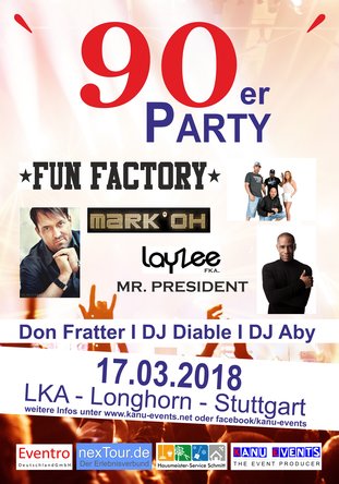 Zwischen den Live Acts und zur Party danach haben wir Euch die Szene DJs der 90er am Table: Den Start übernimmt Don Fratter (Baradox) und DJ ABY (Kanu) die Euch gehörig mit den Beats der 90er versorgen werden. Zum Höhepunkt der Party werden wir Euch noch DJ Diable (Radio DJ, 90´Party,..) auf die Bühne bringen. Mit seinem Gespür für den richtigen Moment schafft er es immer wieder den Saal zum Kochen zu bringen..